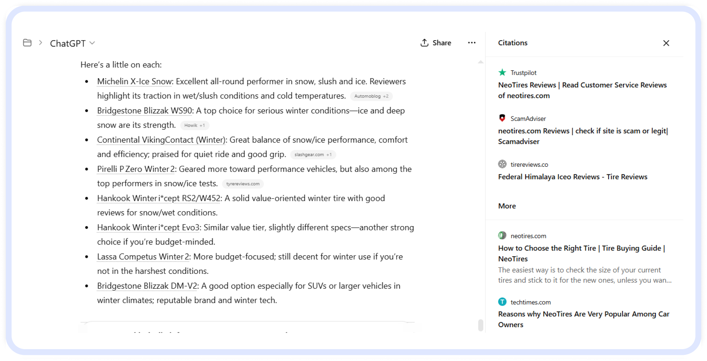 When we entered the same query, aka prompt, into ChatGPT, we again got a list of recommended tires and the resources the information is based on. At the top of the list are review platforms. Actually, that demonstrates that AI assistants prefer these resources when choosing which resources are worth citing. However, the Neotires website was listed in the “More” block.